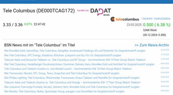 Tele Columbus am 23.5. 6,38%, Volumen 40% normaler Tage