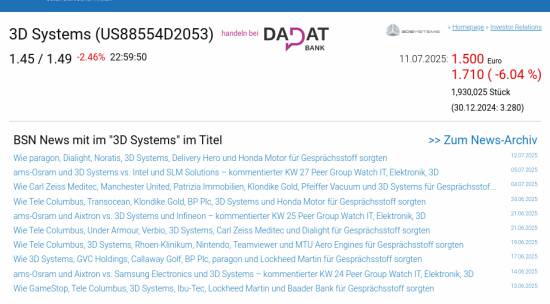 3D Systems am 11.7. -6,04%, Volumen 55% normaler Tage