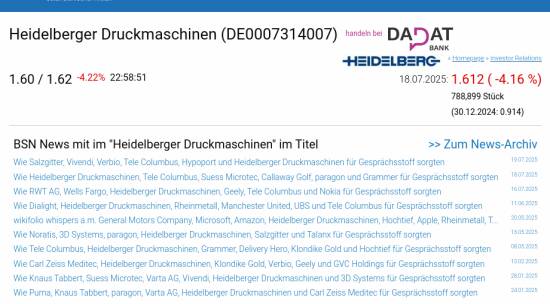 Heidelberger Druckmaschinen am 18.7. -4,16%, Volumen 112% normaler Tage