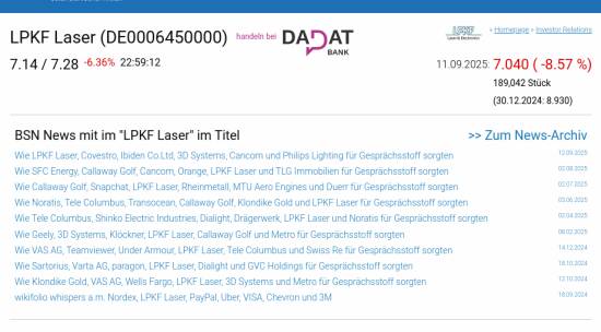 LPKF Laser am 11.9. -8,57%, Volumen 1018% normaler Tage
