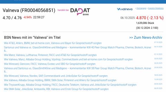 Valneva am 6.10. -2,13%, Volumen 115% normaler Tage
