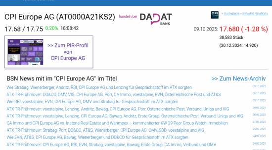 CPI Europe AG am 9.10. -1,28%, Volumen 80% normaler Tage