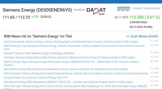 Siemens Energy am 26.11. 5,01%, Volumen 82% normaler Tage