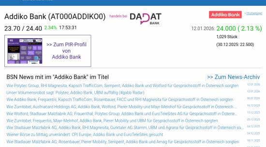 Addiko Bank am 12.1. 2,13%, Volumen 80% normaler Tage
