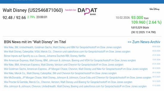Walt Disney am 10.2. 2,64%, Volumen 81% normaler Tage