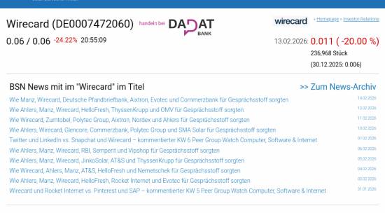 Wirecard am 13.2. -20,00%, Volumen 146% normaler Tage
