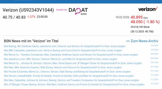 Verizon am 18.2. -1,80%, Volumen 80% normaler Tage