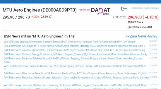 MTU Aero Engines am 27.3. -4,10%, Volumen 118% normaler Tage