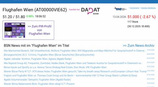 Flughafen Wien am 13.4. -2,67%, Volumen 8% normaler Tage