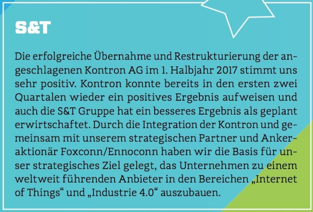 S&T - "Die erfolgreiche Übernahme und Restrukturierung der angeschlagenen Kontron AG im 1. Halbjahr 2017 stimmt uns sehr positiv. Kontron konnte bereits in den ersten zwei Quartalen wieder ein positives Ergebnis aufweisen und auch die S&T Gruppe hat ein besseres Ergebnis als geplant erwirtschaftet. Durch die Integration der Kontron und gemeinsam mit unserem strategischen Partner und Ankeraktionär Foxconn/Ennoconn haben wir die Basis für unser strategisches Ziel gelegt, das Unternehmen zu einem weltweit führenden Anbieter in den Bereichen „Internet of Things“ und „Industrie 4.0“ auszubauen."
