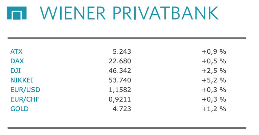 Aus den Morning News der Wiener Privatbank: "Die Wiener Börse hat am Dienstag mit Gewinnen geschlossen. Der ATX beendete den Tag mit einem Plus von 0,93 Prozent auf 5.343,25 Punkte. Der breiter gefasste ATX Prime legte um 0,83 Prozent auf 2.651,32 Zähler zu. Auch die wichtigsten Börsen in Europa beendeten den Tag mit Zuwächsen. Die beherrschenden Themen waren die gestiegene Inflationsrate in der Eurozone und weiter der Iran-Krieg mit seinen wirtschaftlichen Unwägbarkeiten. Mit dem Ölpreisschub im Zuge des Iran-Krieges hat die Inflation in der Eurozone laut den Daten des Statistikamts Eurostat deutlich angezogen. Im Jahresvergleich legten die Verbraucherpreise im März um 2,5 Prozent zu. Im Februar hatte die Inflationsrate bei 1,9 Prozent gelegen. Damit steigt der Druck auf die EZB, bei ihrer nächsten Sitzung Ende April über eine Erhöhung des Leitzinses nachzudenken, um gegen eine steigende Inflation vorzugehen. Von den Börsen kam keine echte Reaktion. Die Ökonomen der Commerzbank glauben aber nicht, dass mit den Daten die Wahrscheinlichkeit von gegensteuernden Zinserhöhungen gestiegen ist. Die Kerninflation ohne Energie, Nahrungs- und Genussmittel sei geringfügig sogar gesunken, so die Experten.