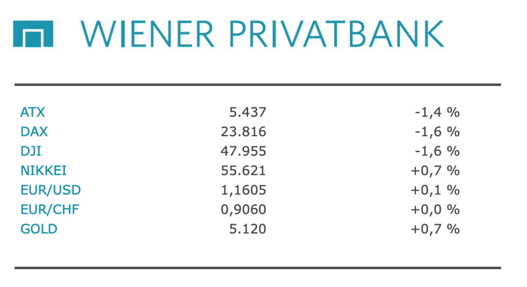 Aus den Morning News der Wiener Privatbank: "Der Wiener Leitindex ATX schloss 1,42 Prozent im Minus bei 5.437,32 Punkten. Damit gab er die Erholungsgewinne des Vortages praktisch vollständig wieder ab, blieb aber noch über dem Zwischentief vom Dienstag bei 5.334 Zählern. Im frühen Handel hatte sich das Börsenbarometer noch bis knapp über die 50-Tage-Durchschnittslinie bei 5.556 Punkten vorgearbeitet. Eine Entspannung im Iran-Krieg ist weiterhin nicht in Sicht. Besonders besorgt zeigen sich die Rohstoffmärkte über die Lage an der Straße von Hormus, durch die ein großer Teil des globalen Ölhandels abgewickelt wird. Der Schiffsverkehr durch diese Wasserstraße ist nahezu zum Erliegen gekommen. Die steigenden Ölpreise verstärkten die Sorgen vor zunehmendem Inflationsdruck. Am Euro-Geldmarkt werden im weiteren Jahresverlauf auch Leitzinsanhebungen nicht ausgeschlossen.