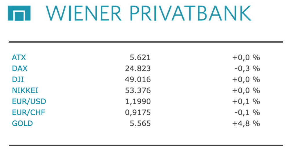 Aus den Morning News der Wiener Privatbank: "Die Wiener Börse hat gestern Mittwoch gut behauptet geschlossen und damit den Rekordkurs sehr gebremst fortgesetzt. Der Leitindex ATX legte um 0,02 Prozent auf 5.620,66 Punkte zu. Auch an den europäischen Leitbörsen agierten die Anleger vor der am Abend anstehenden Bekanntgabe der US-Leitzinsentscheidung zurückhaltend. Nach drei Senkungen des Leitzinsbandes in Folge auf zuletzt 3,50 bis 3,75 Prozent ist nun mit einem Stillhalten zu rechnen. Dafür sprechen nach Einschätzung der Experten die noch oberhalb des Fed-Ziels liegende Inflation und die Konjunkturzahlen, die in der jüngsten Zeit mehrheitlich positiv überrascht haben.