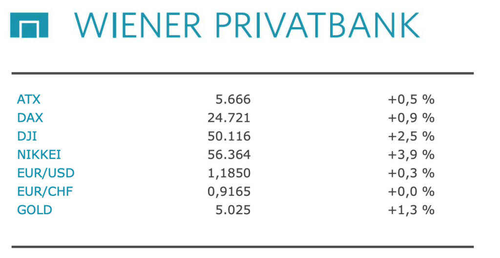Aus den Morning News der Wiener Privatbank: "Die Wiener Börse hat sich am Freitag mit Gewinnen aus dem Handel verabschiedet. Der ATX legte zum Wochenausklang um 0,51 Prozent auf 5.665,53 Punkte zu. Unter der Woche hatte der österreichische Leitindex erstmals die Marke von 5.700 Zählern überschritten. Der mehr Aktien umfassende ATX Prime schloss 0,44 Prozent im Plus bei 2.813,77 Einheiten. An anderen europäischen Börsen wurden zumeist ebenfalls Gewinne verzeichnet. Nationalbank-Gouverneur Martin Kocher sieht die Inflation in Österreich deutlich auf dem Rückzug und kündigt eine Senkung der Wirtschaftsprognose an. Trotz der sinkenden Inflation rechnet er nicht mit einem sofortigen Anspringen des Konsums. Die Stimmung sei weiterhin gedrückt, da sich das Preisniveau in den letzten Jahren "massiv erhöht" habe. In den USA ist das von der Universität Michigan erhobene Konsumklima im Februar laut einer ersten Schätzung stärker gestiegen als erwartet. Verbessert hat sich Beurteilung der aktuellen Lage durch die Verbraucher. Die Erwartungen gaben hingegen etwas nach.