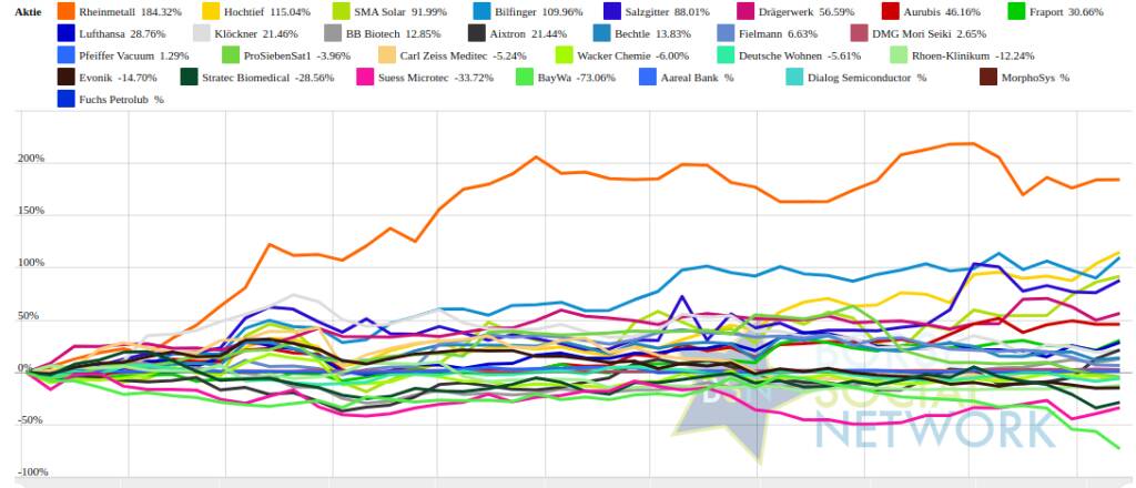 In der Wochensicht ist vorne: Suess Microtec 10,56% vor Salzgitter 10,11%, Bilfinger 9,24%, Fraport 6,68%, Carl Zeiss Meditec 4,45%, Drägerwerk 4,15%, Lufthansa 4,1%, Hochtief 3,87%, Stratec Biomedical 2,91%, Deutsche Wohnen 2,62%, Rheinmetall 2,49%, Klöckner 2,08%, Rhoen-Klinikum 1,67%, ProSiebenSat1 1,44%, Evonik 1,44%, BB Biotech 1,22%, Bechtle 1,16%, Aixtron 1,11%, Fuchs Petrolub 0,55%, SMA Solar 0,49%, Pfeiffer Vacuum 0,26%, Dialog Semiconductor 0%, MorphoSys 0%, Aareal Bank -0,15%, DMG Mori Seiki -0,21%, Aurubis -1,08%, Wacker Chemie -1,71%, Fielmann -2,65%, BayWa -39,8% und