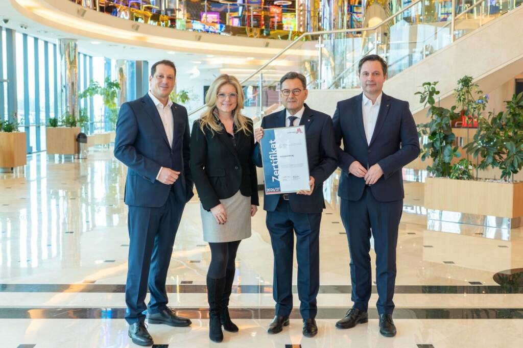 Die NOVOMATIC AG wurde von der unabhängigen Exzellenz-Plattform Leitbetriebe Austria auch für die Periode 2026/2027 als „Österreichischer Leitbetrieb“ ausgezeichnet. Foto v.li.: Mag. Stefan Krenn, Mag. Monica Rintersbacher, Dipl.-Ing. Ryszard Presch, Mag. Johannes Gratzl; Copyright: NOVOMATIC