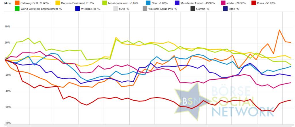 Weitere Highlights: adidas ist nun 3 Tage im Plus (4,75% Zuwachs von 159,9 auf 167,5), ebenso Borussia Dortmund 5 Tage im Minus (2,99% Verlust von 3,34 auf 3,24), William Hill 3 Tage im Minus (0,92% Verlust von 3,16 auf 3,13), Nike 3 Tage im Minus (12,57% Verlust von 122,53 auf 107,13).
