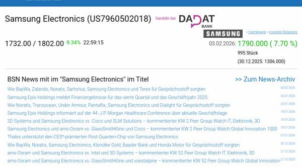 Samsung Electronics am 3.2. 7,70%, Volumen 181% normaler Tage