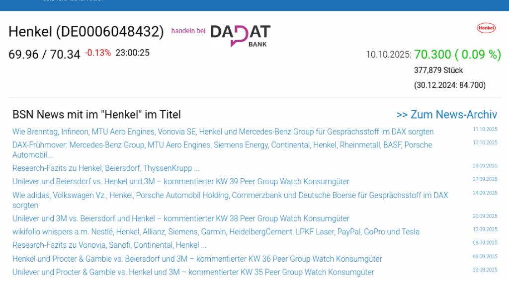 Henkel am 10.10. 0,09%, Volumen 81% normaler Tage