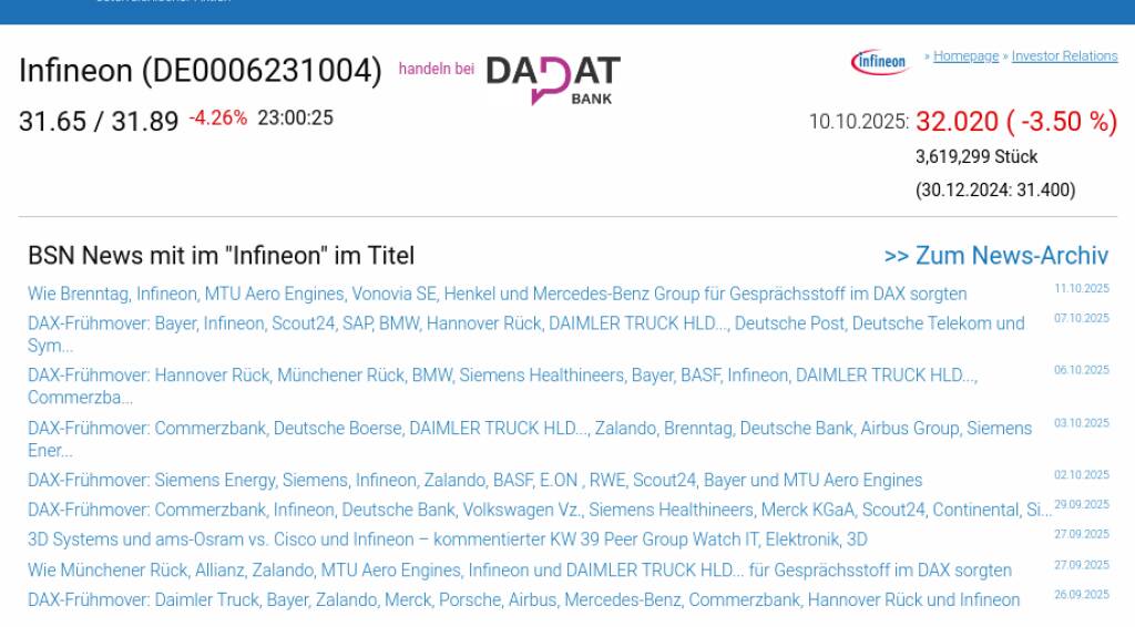 Infineon am 10.10. -3,50%, Volumen 83% normaler Tage