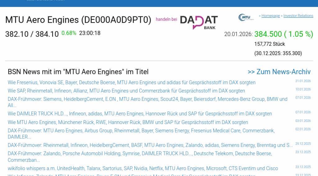 MTU Aero Engines am 20.1. 1,05%, Volumen 124% normaler Tage