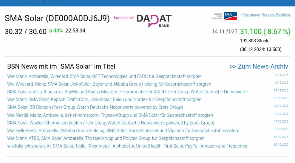 SMA Solar am 14.11. 8,67%, Volumen 85% normaler Tage