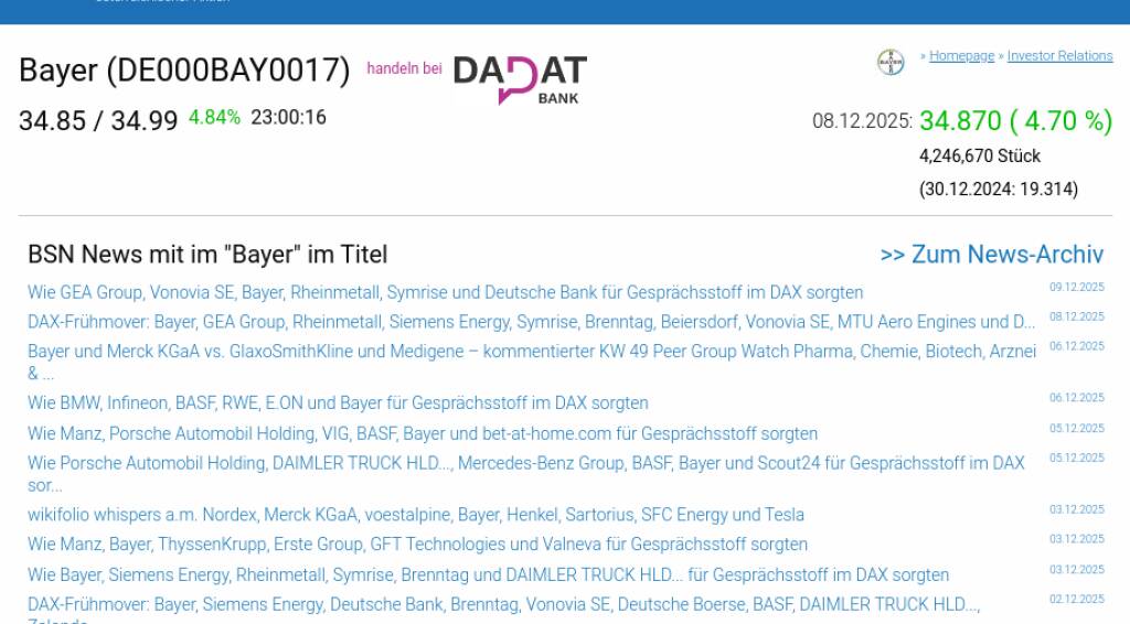 Bayer am 8.12. 4,70%, Volumen 126% normaler Tage