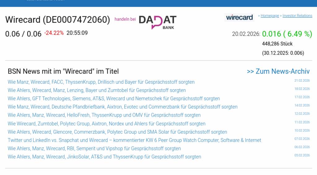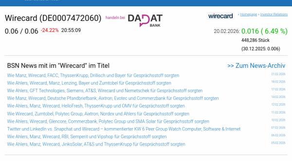 Wirecard am 20.2. 6,49%, Volumen 189% normaler Tage
