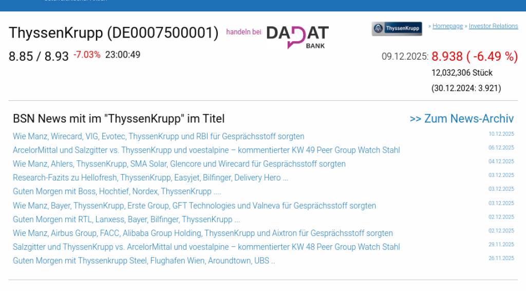 ThyssenKrupp am 9.12. -6,49%, Volumen 250% normaler Tage