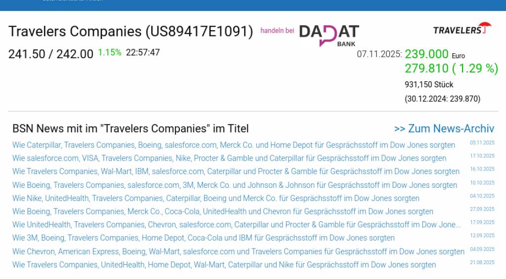 Travelers Companies am 7.11. 1,29%, Volumen 71% normaler Tage