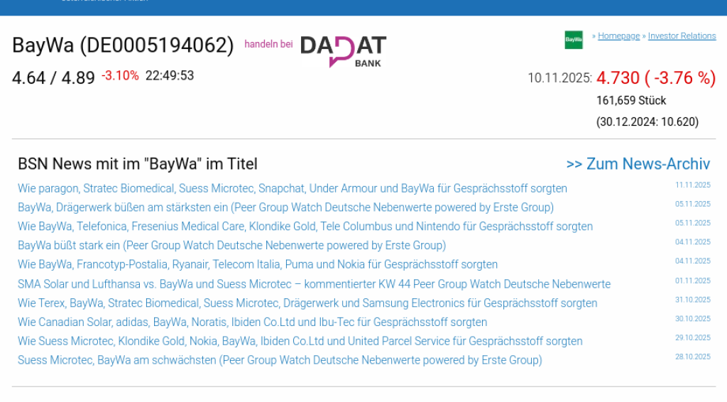 BayWa am 10.11. -3,76%, Volumen 435% normaler Tage