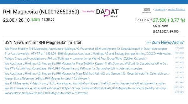 RHI Magnesita am 17.11. 3,77%, Volumen 126% normaler Tage