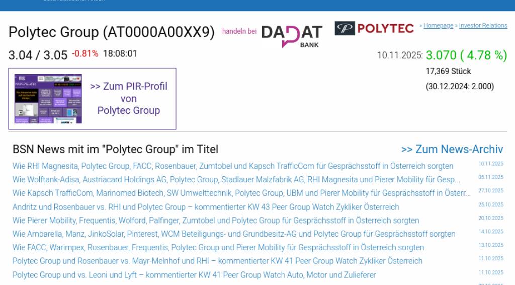 Polytec Group am 10.11. 4,78%, Volumen 106% normaler Tage