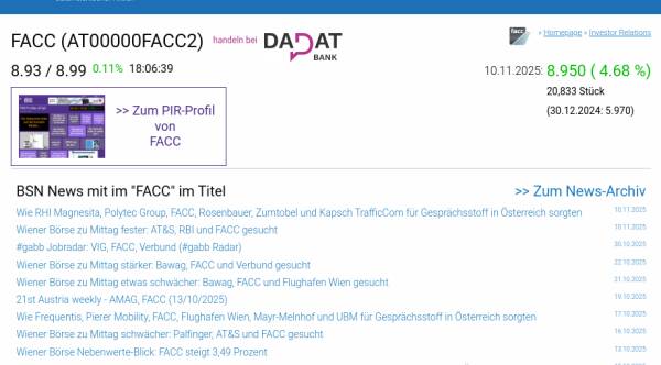 FACC am 10.11. 4,68%, Volumen 54% normaler Tage