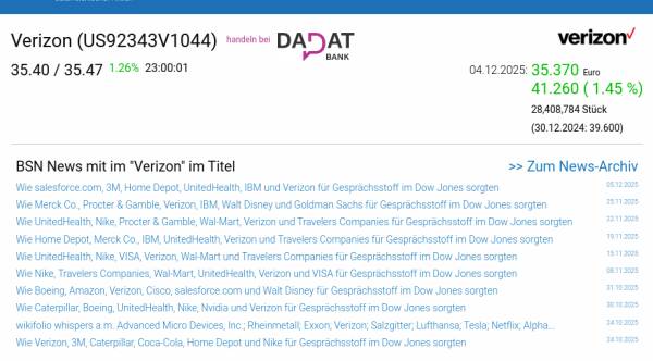 Verizon am 4.12. 1,45%, Volumen 126% normaler Tage