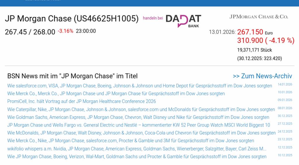 JP Morgan Chase am 13.1. -4,19%, Volumen 189% normaler Tage