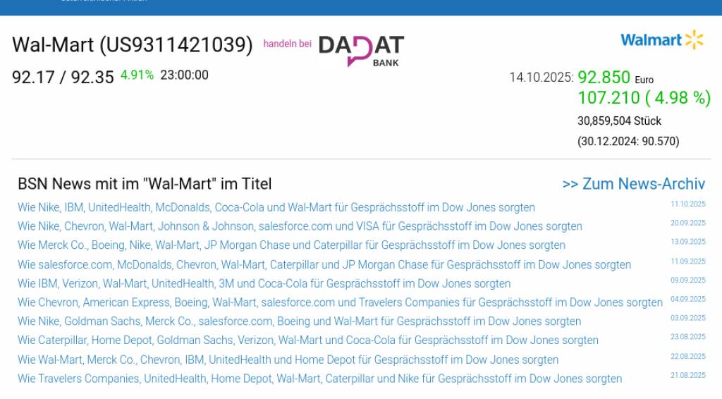 Wal-Mart am 14.10. 4,98%, Volumen 165% normaler Tage