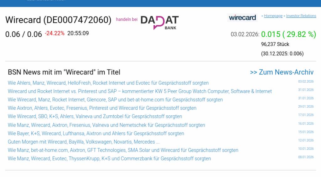 Wirecard am 3.2. 29,82%, Volumen 84% normaler Tage
