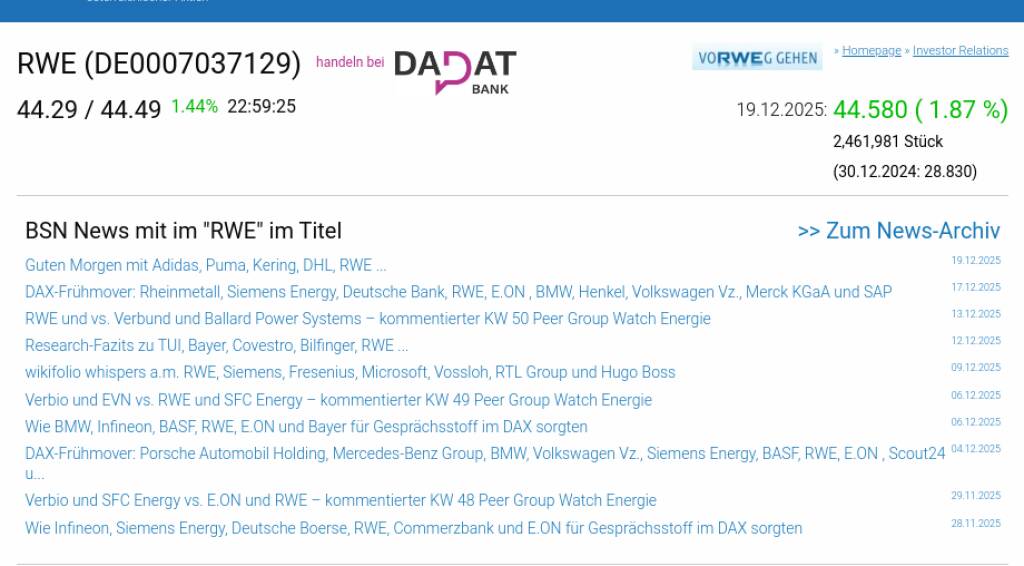 RWE am 19.12. 1,87%, Volumen 111% normaler Tage