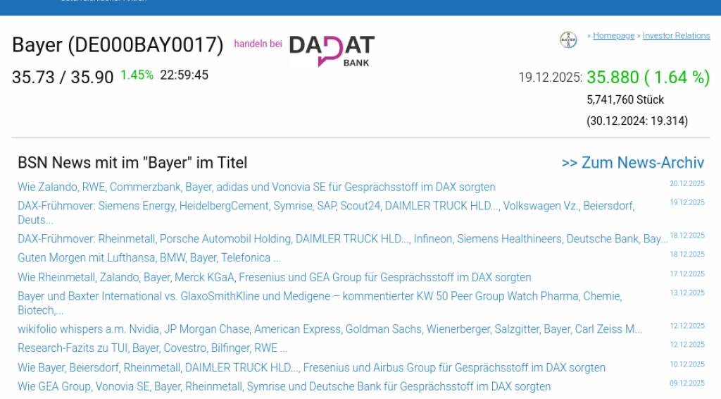 Bayer am 19.12. 1,64%, Volumen 170% normaler Tage
