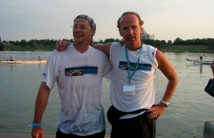 Charly Mauracher und ich. Als wir noch jünger und Schlagmänner eines sauschnellen Drachenboots waren (und frisch aus dem Wasser kamen).