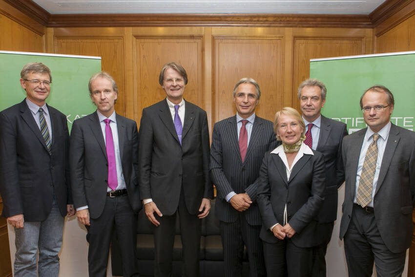 Der Beirat des Zertifikate Forum Austria (v.li.): Engelbert Dockner, Christian Drastil, Hartmut Knüppel, Wolfgang Traindl, Heike Arbter (Vorsitzende des Vorstandes, Zertifikate Forum Austria), Bernhard Grabmayr, Ernst Marschner; nicht mit am Bild: Birgit Kuras(c) Martina Draper für finanzmarktfoto.at / ZFA