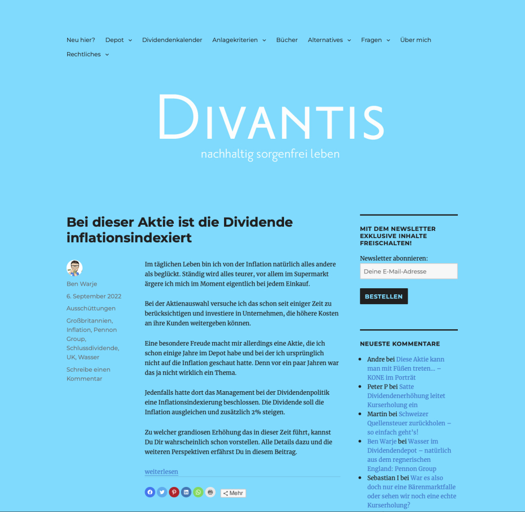 Ich bin Ben. Ich beschreibe seit Januar 2017 auf Divantis, wie ich mit meinem nachhaltigen Dividendendepot langfristig anlege und Erträge erziele. Alle meine Beiträge sind real und mit echtem Geld. Ich belege das mit den Originalabrechnungen meiner Depotbanken.Mein Motto und mein Ziel lautet „nachhaltig sorgenfrei leben“.