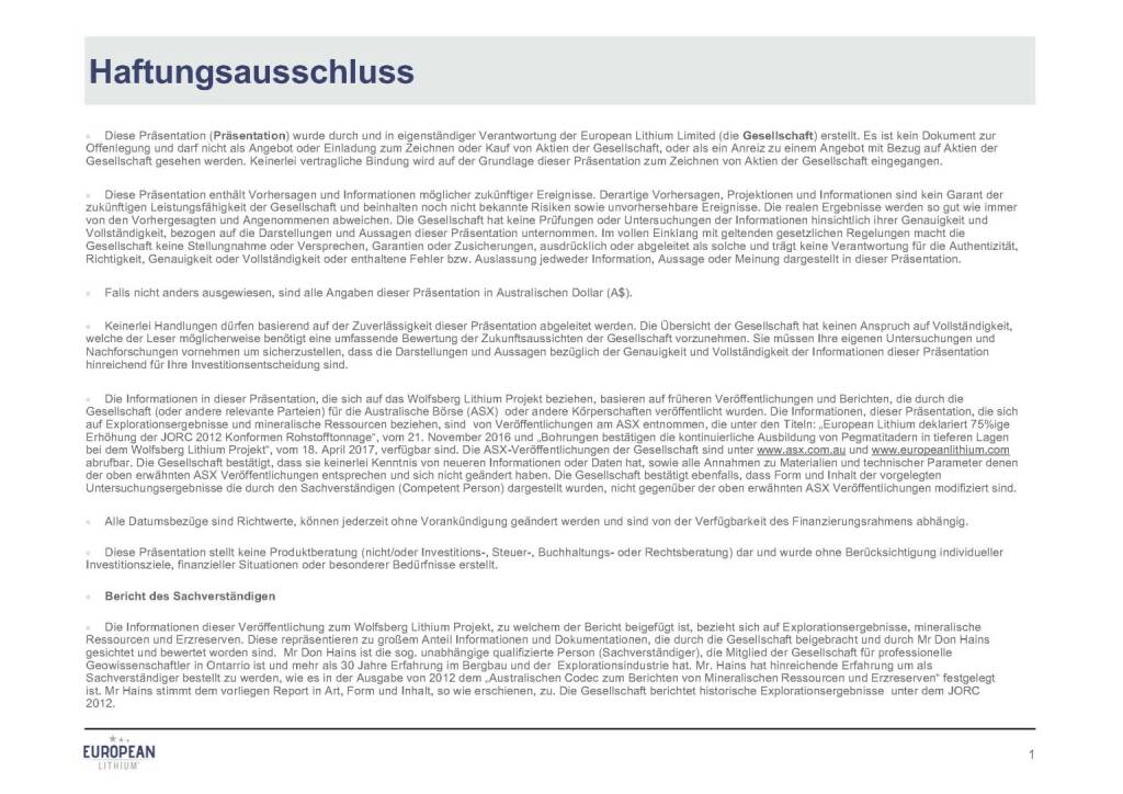 „ Präsentation European Lithium - Investitionseckpunkte “