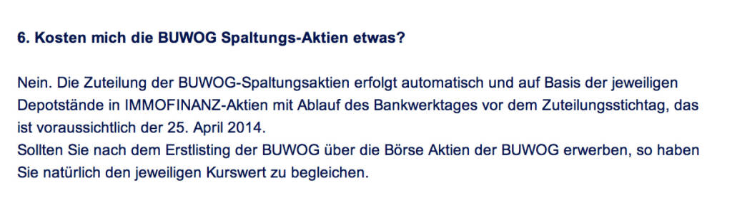 „ Frage an Immofinanz/ Buwog: Kosten mich die Buwog Spaltungs-Aktien etwas? “