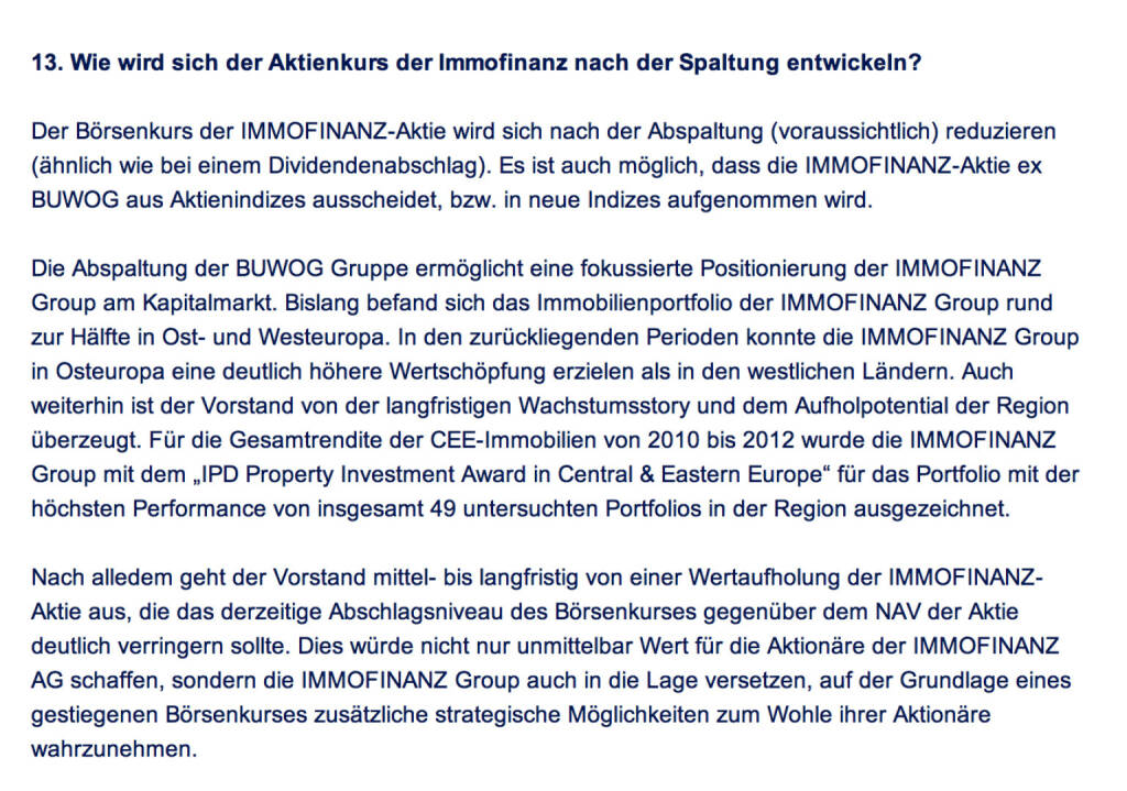 „ Frage an Immofinanz/ Buwog: Wie wird sich der Aktienkurs der Immofinanz nach der Spaltung entwickeln? “