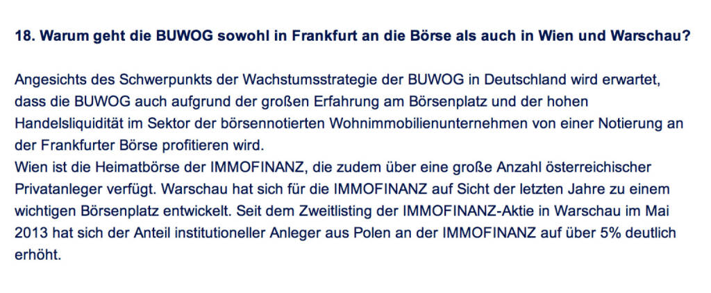 „ Frage an Immofinanz/ Buwog: Warum geht die Buwog sowohl in Frankfurt an die Börse als auch in Wien und Warschau? “