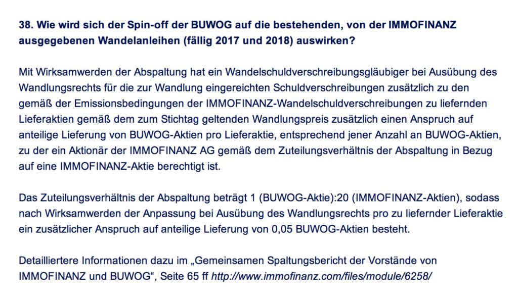 „ Frage an Immofinanz/ Buwog: Wie wird sich der Spin-off der Buwog auf die bestehenden, von der Immofinanz ausgegebenen Wandelanleihen (fällig 2017 und 2018) auswirken? “